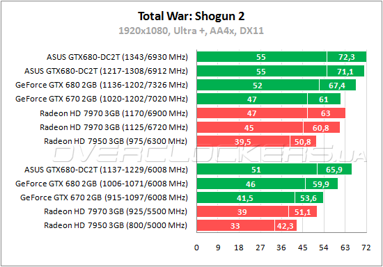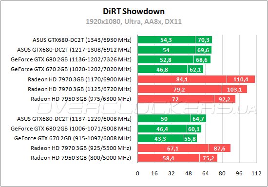 Showdown — еще одна игра, оптимизированная под видеокарты AMD. И тут отставание GeForce GTX 680 от конкурента просто катастрофично. Даже при разгоне не удается достигнуть уровня Radeon HD 7950 в номинале, не говоря уже о старшем Radeon HD 7970. Обращает на себя внимание мизерная разница на разогнанных GeForce GTX 680. Похоже, потенциал ASUS сдерживает низкая частота памяти, поэтому при существенном превосходстве по частоте GPU эта карта незначительно быстрее Gigabyte с частотами 1136—1202/7326 МГц.