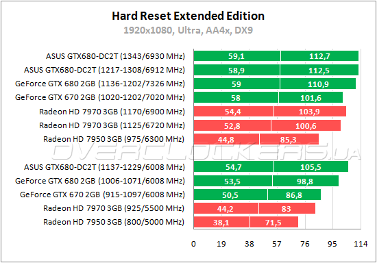 В игре Hard Reset лучшие результаты у GeForce. Преимущество TOP-версии ASUS над референсом менее 7%, разница с Radeon HD 7970 составляет 24—27%. В разгоне разница между разными GeForce GTX 680 стремится к нулю, но тут, похоже, сказывается и недостаточная производительность процессора.