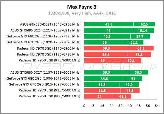 Разница между GeForce GTX 680 и ASUS GTX680-DC2T-2GD5 в третьем Max Payne составляет 10%. Radeon HD 7970 слабее рассматриваемого видеоадаптера на 24% по минимальному fps и 15% по среднему. При разгоне в умеренном режиме преимущество ASUS над HD 7970 составляет 4—10%.