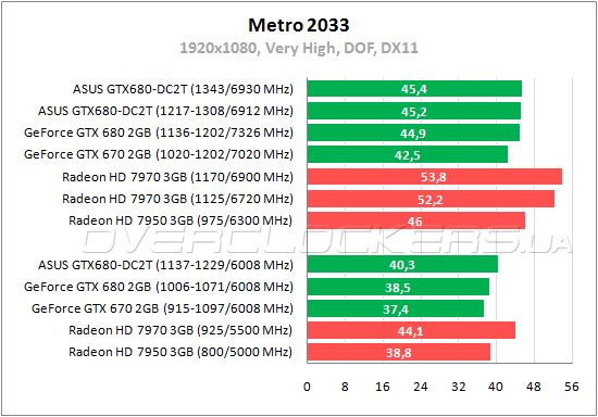 В Metro 2033 GeForce GTX 680 сдает позиции и уступает Radeon HD 7970. В этой игре частота памяти для Kepler тоже играет важную роль, что видно по мизерному преимуществу ASUS над референсным Gigabyte в разгоне — у первого существенный выигрыш по частоте GPU, но у второго заметно выше частота GDDR5.
