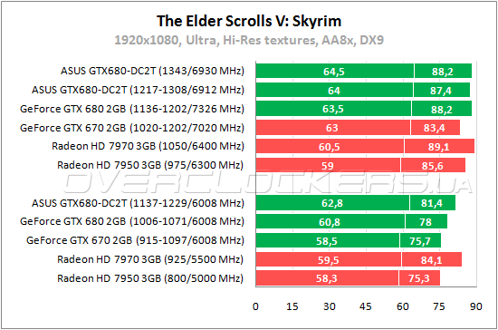 Из-за определенных проблем в Skyrim старший Radeon протестирован при разгоне на невысоких частотах. Но и так прослеживается общая тенденция в номинале и в разгоне, когда карта AMD лучше по среднему fps, а флагман NVIDIA — по минимальному. Впрочем, любой из видеокарт в данном сравнении вполне хватает для комфортной игры.