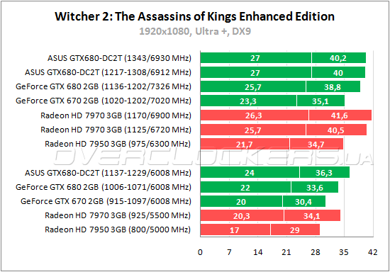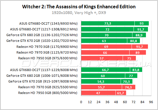 В «Ведьмаке 2» снова лидирует ASUS GTX680-DC2T-2GD5. Отставание Radeon HD 7970 составляет 13—20% в более простом режиме и 6—18% с «запредельным качеством». При разгоне конкуренты идут почти наравне, но ASUS удерживает небольшое преимущество по минимальному fps.