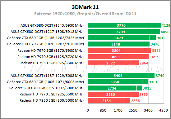 ASUS на 11,7% обгоняет обычный GeForce GTX 680 по GPU Score. Разгон дает прирост еще в 9%, а на модифицированном BIOS получаем еще 1,6%. В номинале Radeon HD 7970 слабее рассматриваемого адаптера на 32%.