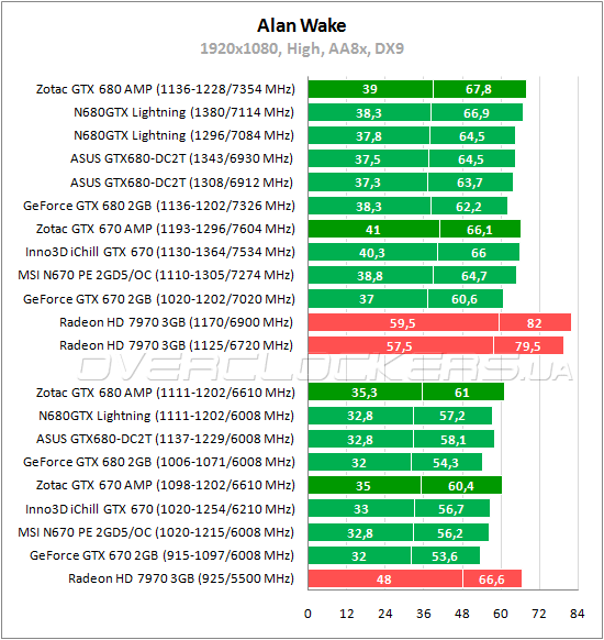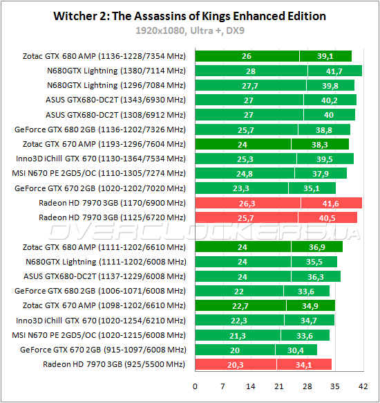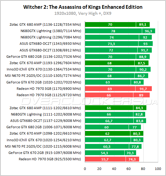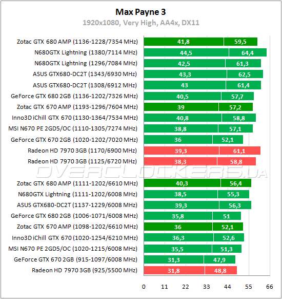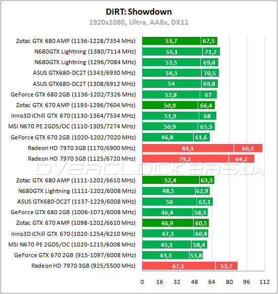Оба Zotac в Showdown лидируют среди своих аналогов от других производителей. В разгоне их традиционно обходят MSI N680GTX Lightning и ASUS GTX680-DC2T-2GD5. Игра оптимизирована под решения AMD, поэтому Radeon HD 7970 тут вне конкуренции.