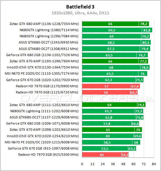 В Battlefield 3 позади уже оказывается Radeon HD 7970. Обогнать топовые версии GTX 680 от MSI и ASUS младшему Zotac в этот раз не удается, но отставание от них мизерное. Старший Zotac в номинале уверенно занимает место лидера, но при разгоне уже уступает N680GTX Lightning и GTX680-DC2T-2GD5, хотя и с минимальным отставанием.