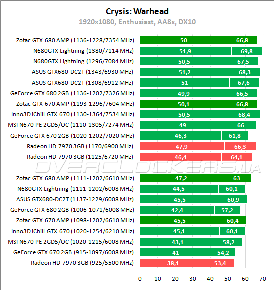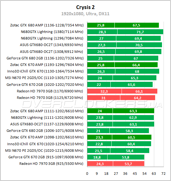 В Crysis 2 Zotac GTX 670 AMP! Edition занимает первое место среди идентичных карт и обходит на 4—10% референсный GeForce GTX 680. Старший Zotac быстрее своего собрата не более чем на 5%, демонстрируя мизернейший отрыв от видеокарт MSI и ASUS. При разгоне последние берут реванш. Но разницу снова никак нельзя назвать внушительной.