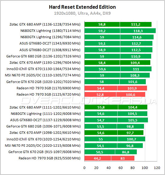 В Hard Reset впервые Zotac GTX 670 AMP! Edition в номинале пасует перед Inno3D iChill GTX 670 HerculeZ 3000. Но старший Zotac GTX 680 AMP! Edition держится наравне с соперниками от ASUS и MSI. Ситуация при разгоне немного меняется и последние уже укрепляют свои лидерские позиции.