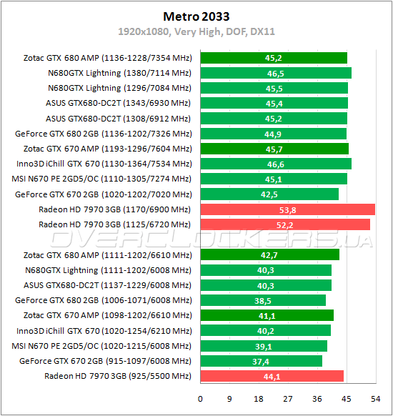 В тесте Metro 2033 среди GeForce GTX 670 лучше всех карта Zotac. Аналогично и старший AMP-брат занимает первое место среди GeForce GTX 680. При повышении частот оба они уступают лишь MSI Lighting и Inno3D iChill, у которых частота GPU превышает рубеж в 1350 МГц.