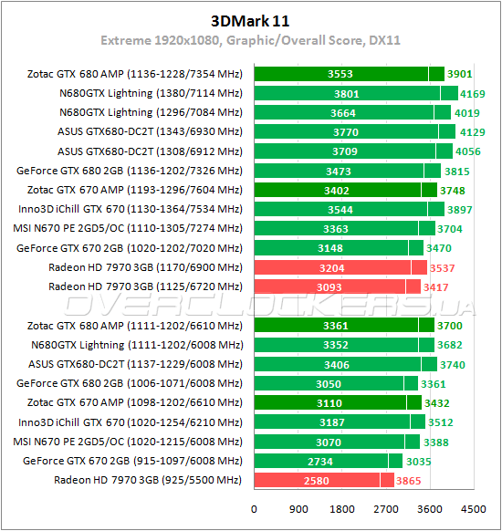У младшего Zotac преимущество почти в 14% над референсным GeForce GTX 670 и на 2% более высокий результат в сравнении с обычным GeForce GTX 680. Разница с Zotac GTX 680 AMP составляет 8%. При разгоне Zotac GTX 670 AMP немного уступает inno3D GTX 670, а старший Zotac проигрывает парочке лидеров от ASUS и MSI.