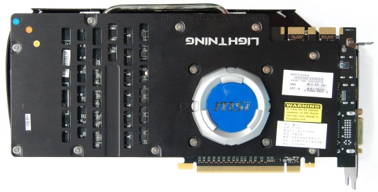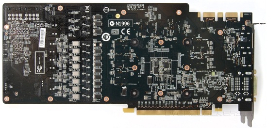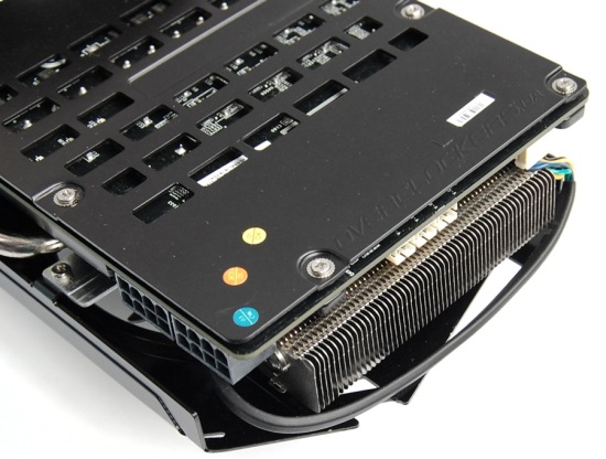 Обратная сторона видеокарты закрыта металлической пластиной. Над графическим чипом располагается GPU Reactor, накрытый защитным пластиковым колпачком.