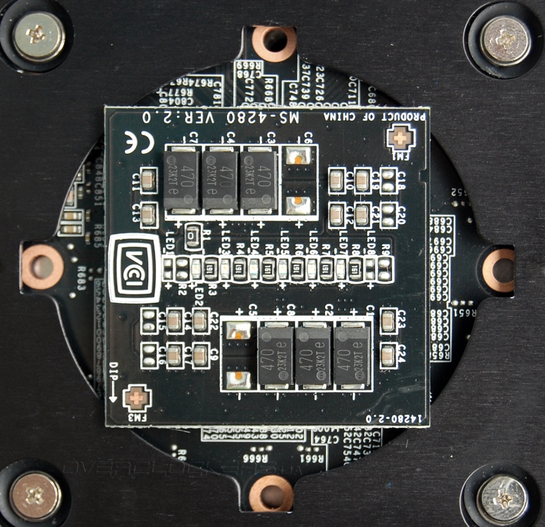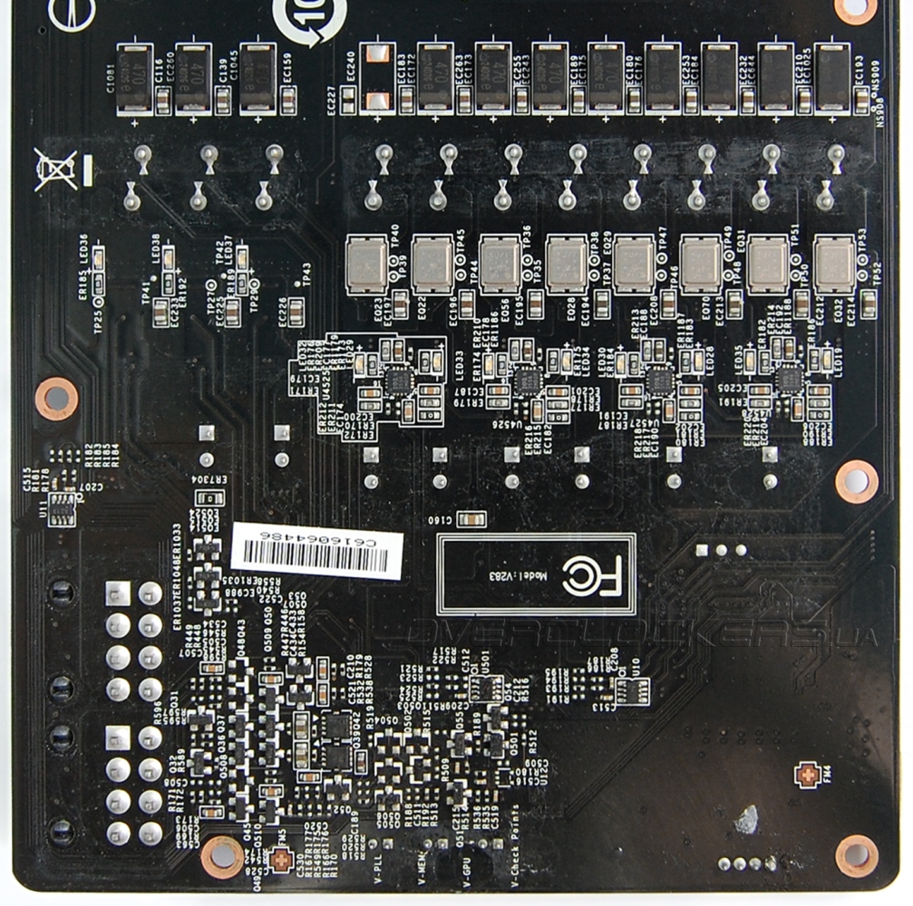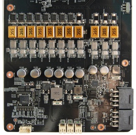 Элементы узла питания разнесены на обе стороны текстолита. Графический процессор запитан от восьмифазного преобразователя напряжения. Система питания памяти насчитывает три фазы. Реализована технология активного переключения фаз в зависимости от нагрузки. Светодиоды на обратной стороне платы сигнализируют об активных фазах.