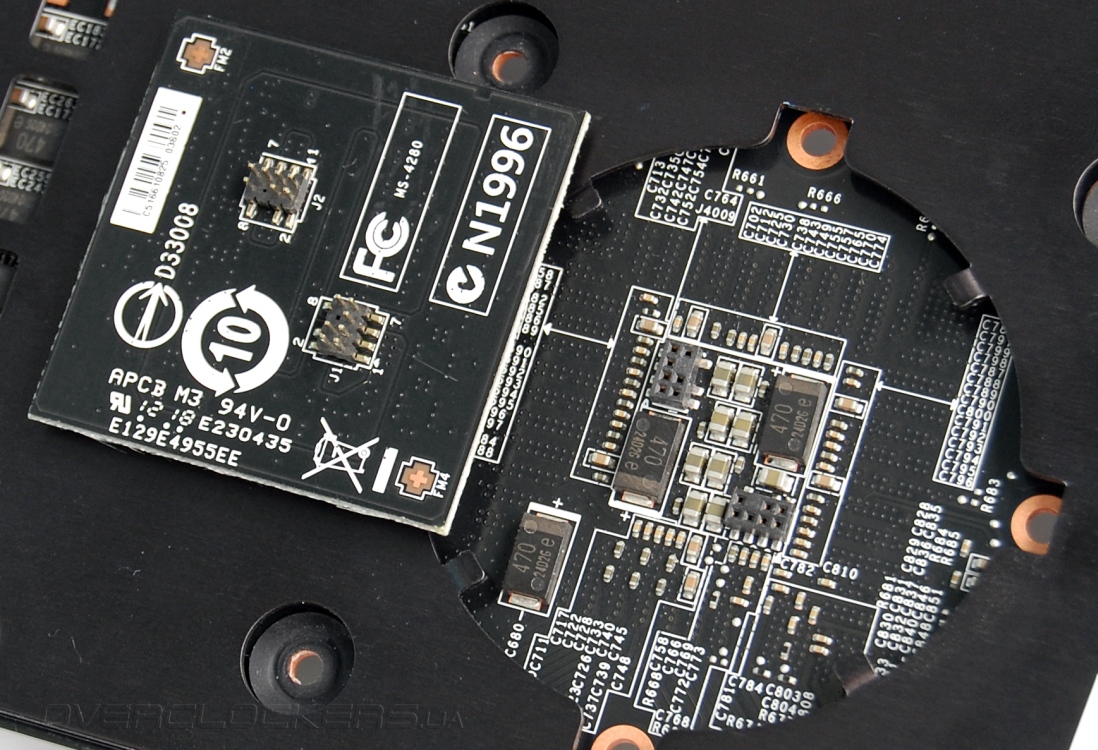 Этот дополнительный блок, выполненный на отдельной плате, обеспечивает сглаживание пульсаций напряжения, что положительно влияет на стабильность при разгоне. Но из-за него возникнут проблемы с установкой видеокарты в верхний слот PCI Express на некоторых конфигурациях, особенно при использовании массивного кулера на процессоре. Хотя ничего смертельного в этом нет — GPU Reactor можно демонтировать, N680GTX Lightning работает и без него.