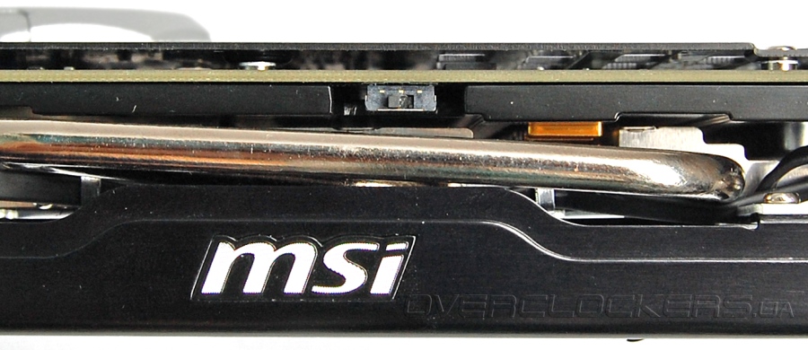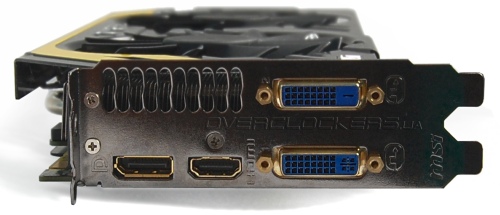 Видеокарта запитана от двух восьмиконтактных разъемов. На боковую грань вынесены разъемы для замера напряжений. У MSI этот процесс максимально упрощен, благодаря специальным переходникам, рассчитанным на щупы измерительных проборов. Вот только подписаны разъемы на плате, а надписи скрыты за пластиной. Да и расположение самих разъемов не столь удобное, как в старых моделях, когда точки для замера напряжения выносились на сторону, обращенную к внешней стенке корпуса. Впрочем, это все равно намного удобнее ASUS HotWire. Да и прибегать к подобным возможностям по контролю напряжений будут в основном оверклокеры-энтузиасты, которые для своих экспериментов используют открытый стенд, а там с доступом к соответствующим разъемам никаких проблем не будет.
