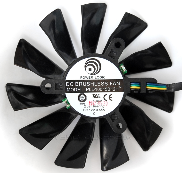 Используются вентиляторы Power Logic PLD10015B12H с двойным шариковым подшипником. Их диаметр 100 мм. Нечасто встретишь таких гигантов на видеокартах. Подобными «мельницами» могут еще похвастать только ASUS с трехслотовым охлаждением DirectCU II.