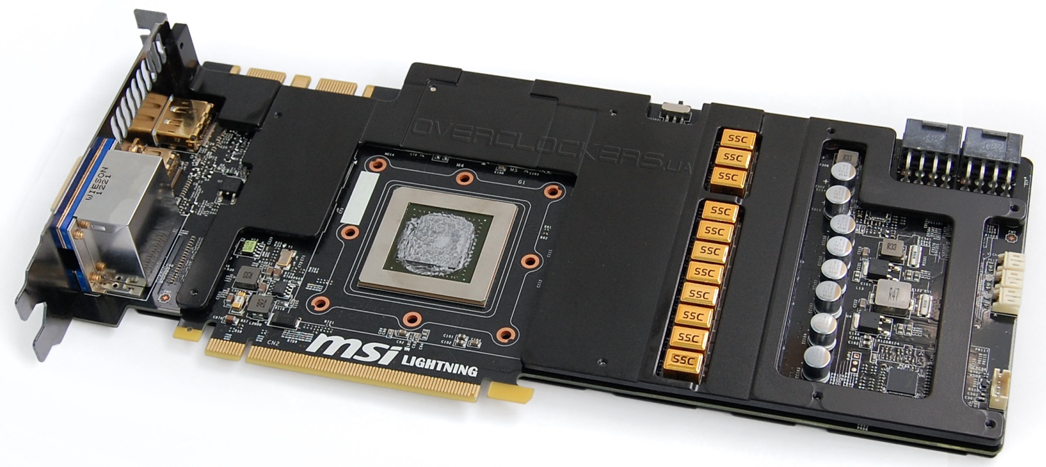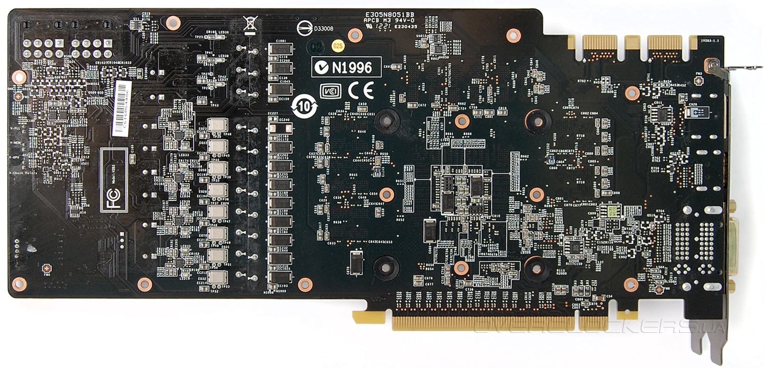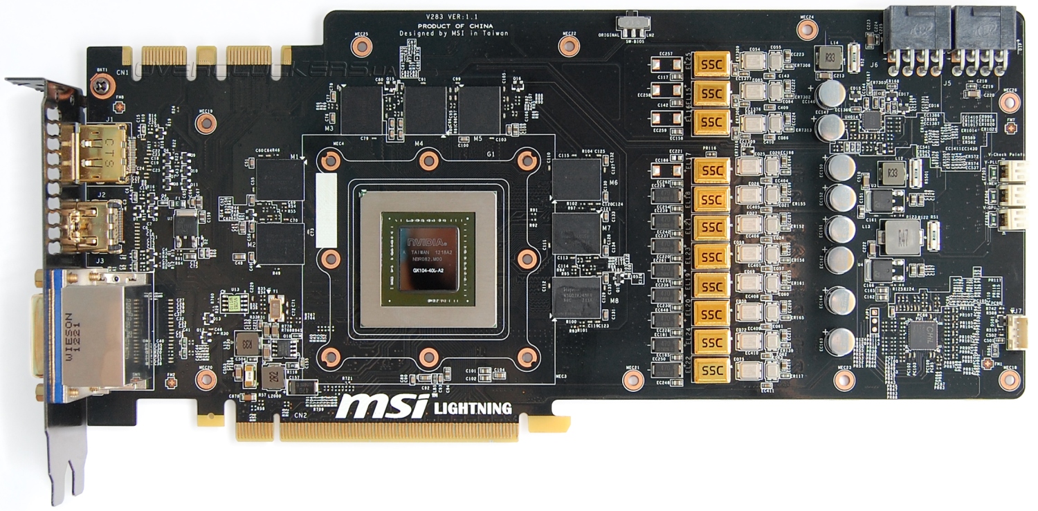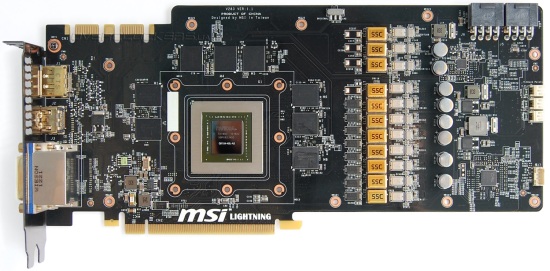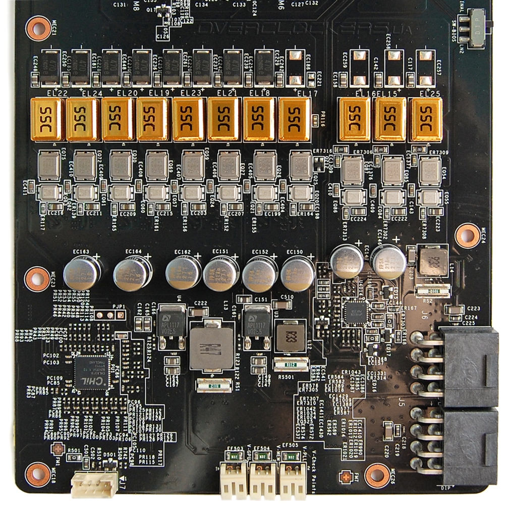 Дизайн печатной платы напоминает дизайн R7970 Lightning. Выполнена она по технологии LPL (Lightning Power Layer), что предполагает независимую разводку линий питания графического процессора, памяти и земли по раздельным слоям внутри текстолита. Это помогает уменьшить различные наводки и даже немного улучшает общее охлаждение платы. Видеокарта построена на высококачественных компонентах Military Class III. Это конденсаторы Hi-c CAP с танталовой сердцевиной и конденсаторы с твердотельным электролитом Dark Solid CAP. Последние имеют не только улучшенные рабочие характеристики, но и специальное защитное никелированное покрытие. Даже фирменные дроссели SSC имеют специальное золотое покрытие. Вместо обычных «мосфетов» используются исключительно CopperMOS — лучшие на данный момент по рабочим характеристикам полевые транзисторы в медном корпусе, что позволяет наиболее эффективно отводить от них тепло.