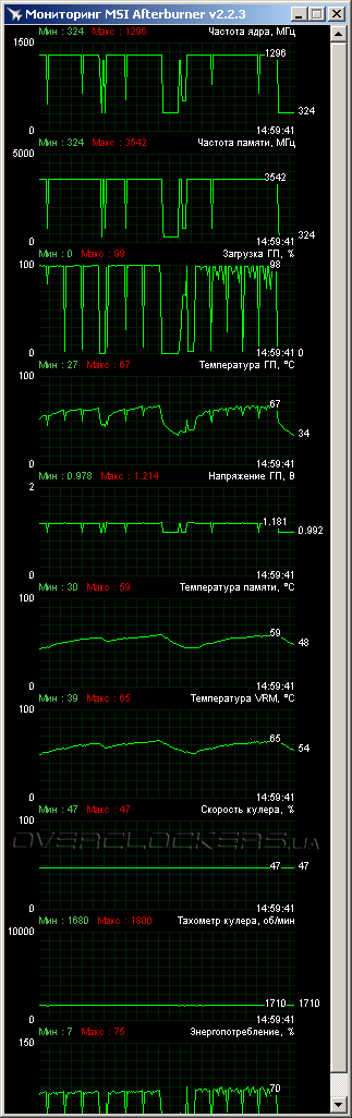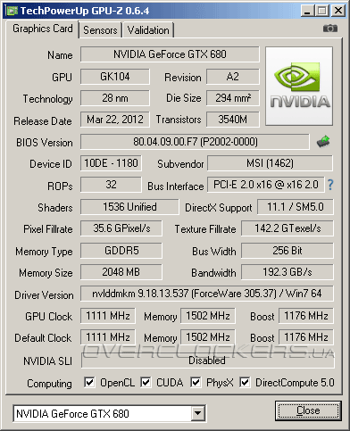 Изначально мы проверили возможности разгона без повышения напряжения, воспользовавшись лишь переключением на разблокированный BIOS. В таком режиме была достигнута стабильность на частоте ядра в 1296 МГц. Базовую частоту не имеет смысла указывать, потому как она значительно меньше, и все равно просадок ниже 1296 МГц не было. Память одолела 7084 МГц. При более высоких частотах GDDR5 наблюдались падения производительности. Эти результаты не далеко ушли от разгона нашего экземпляра ASUS GTX680-DC2T-2GD5 со стандартным BIOS — 1308/6912 МГц. Но преимущество по частоте памяти порадовало, это очень актуально для GeForce GTX 680 во многих игровых приложениях. И главное, что на частотах 1296/7084 наш MSI спокойно работал при низком уровне шума — мы увеличили скорость вентиляторов лишь до 1700 об/мин. Пиковая температура в Hard Reset не превысила 67 °C.