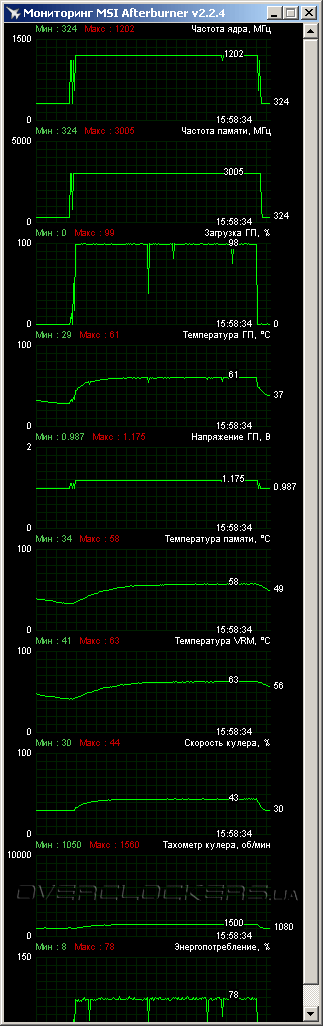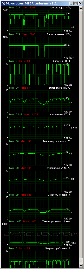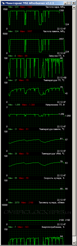 Используя возможности софтвольтмода смогли достичь 1380 МГц. При большей частоте ядра уже наблюдались проблемы с некоторыми приложениями. Напряжение было повышено на 87 мВ. Для стабильной работы обороты пришлось поднять еще выше — до уровня 2100 об/мин. Гул при этом весьма заметный, но все равно не особо высокий.