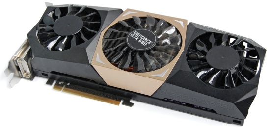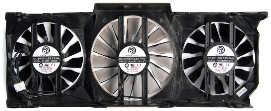Palit занимает три слота расширения. Поверхность карты немного выгнута, хотя вентиляторы расположены в одной плоскости, а не под углом друг к другу как это было в многовентиляторных видеоадаптерах Gigabyte.