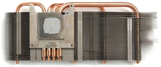 Пластины радиатора напаяны на толстое основание. Конструкцию пронизывают четыре тепловые трубки: две диаметром 6 мм и две по 8 мм.