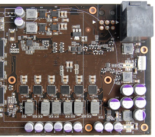 В данном случае у нас стандартное расположение разъемов питания — в виде вертикальной колодки. Но один из разъемов восьмиконтактный, у референса — два шестиконтактных.