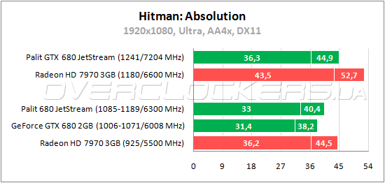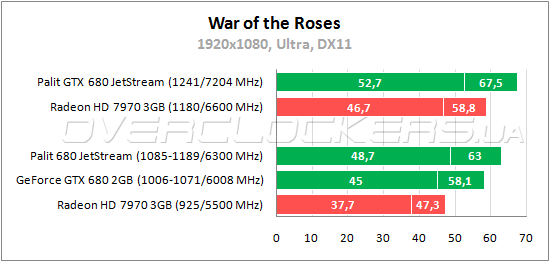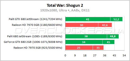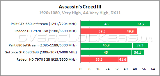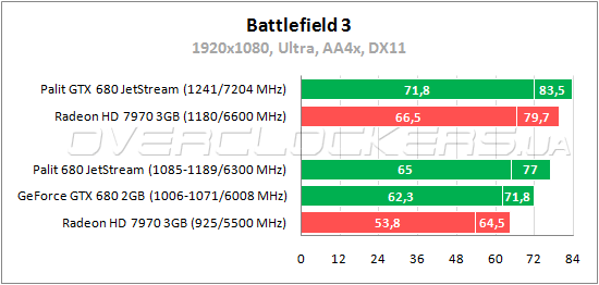 Огромное преимущество GeForce над Radeon в этой игре. Разница по средней частоте достигает 29%, по минимальному fps — 36%. Даже при разгоне HD 7970 не удается достигнуть уровня простого GTX 680. Преимущество Palit над референсом 8–12%. Максимальное преимущество над референсом при повышении частот до 1241/7206 МГц достигает 17–21%.