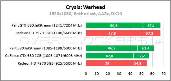В Warhead снова лидирует GeForce GTX 680. Отставание Radeon HD 7970 составляет 10% по минимальному fps и 4% по среднему. У Palit преимущество над референсом в 7–9%. Разгон позволяет выиграть еще 9%. Radeon от разгона получает ускорение на 23%. При разгоне конкуренты равны по средней частоте кадров, но у GeForce меньше просадки fps. Потенциал форсированного Radeon тут сдерживает низкий разгон памяти.