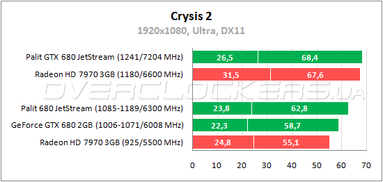 Во втором Crysis у карты NVIDIA лучше результат по среднему fps, но Radeon HD 7970 лучше по минимальному показателю. Примерно такая же ситуация при разгоне, только разница по среднему показателю уменьшается всего лишь до 1%.