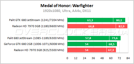 Последняя часть Medal of Honor демонстрирует почти полное равенство между конкурентами. У GeForce GTX 680 крошечный отрыв менее 2% и лишь по среднеигровой частоте кадров. При разгоне на первое место уже выходит Radeon HD 7970.