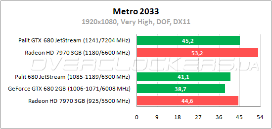 Видеоадаптер AMD лидирует и в Metro 2033 с отрывом в 15% от простого GeForce и с преимуществом в 8,5% над Palit JetStream. При разгоне отрыв Radeon HD 7970 от конкурента лишь усиливается.