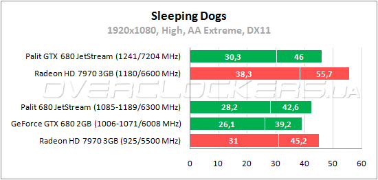 Radeon HD 7970 выходит на первое место в Sleeping Dogs с отрывом 15–19% от простого GeForce GTX 680. И только при максимальном разгоне адаптер NVIDIA выходит на уровень ускорителя AMD в номинале.