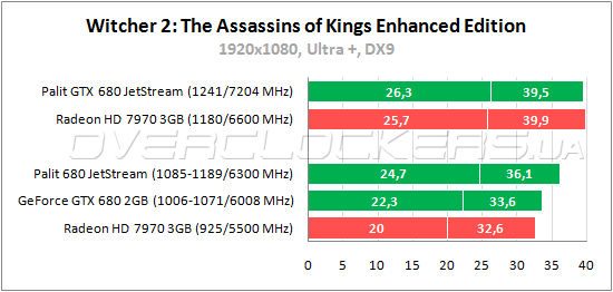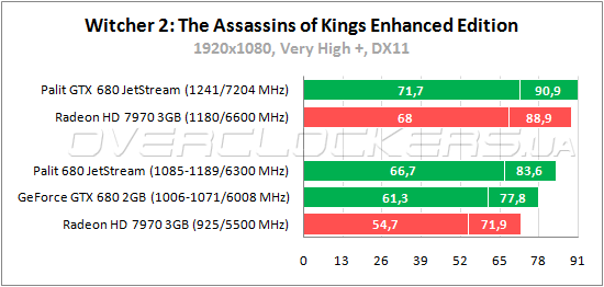 Небольшое преимущество GeForce GTX 680 в 1–6% над конкурентом. У Palit над собратом преимущество в 7%. При разгоне на первое место выходит Radeon. Представителю «зеленых» удается сохранить паритет по минимальному fps.