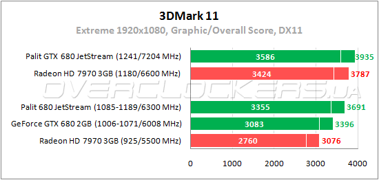 Разница между GeForce GTX 680 и Radeon HD 7970 чуть менее 12%. Преимущество Palit над собратом почти 9%. Максимальная разница между разогнанным JetStream и референсом составляет 16%.