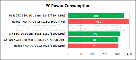 Мизерная разница между GeForce GTX 680 и Radeon HD 7970 в номинале — результат «красной» видеокарты выше лишь на 1 Вт. А вот при разгоне «аппетиты» GeForce уже явно меньше чем у конкурента.
