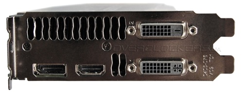 На задней панели расположены разъемы Display Port, HDMI и два DVI. Они занимают значительную площадь, поэтому отверстий для выхлопа воздуха не так уж и много. Частично он реализован и вовнутрь корпуса через прорези сбоку карты возле разъемов SLI.