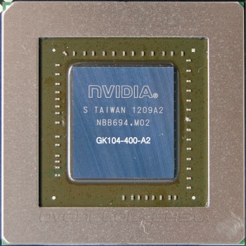 Впервые старший GPU от NVIDIA не имеет теплораспределительной крышки. Во избежание повреждения оголенного кристалла его окружили большой защитной рамкой. Судя по маркировке GK104-400-A2, это не первая ревизия данного графического процессора. Возможно, GPU A1 планировались для более слабых видеоадаптеров, а после перепрофилирования предполагаемого GeForce GTX 660 в GeForce GTX 680 процессор был доработан и переведен на большие частоты, получив ревизию A2.