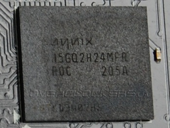 Два гигабайта видеопамяти набраны восемью микросхемами Hynix H5GQ2H24MFR R0C. Микросхемы рассчитаны на рабочую частоту 6 ГГц, что как раз соответствует стандартным характеристикам GeForce GTX 680. И запас для разгона, предположительно, будет небольшой.