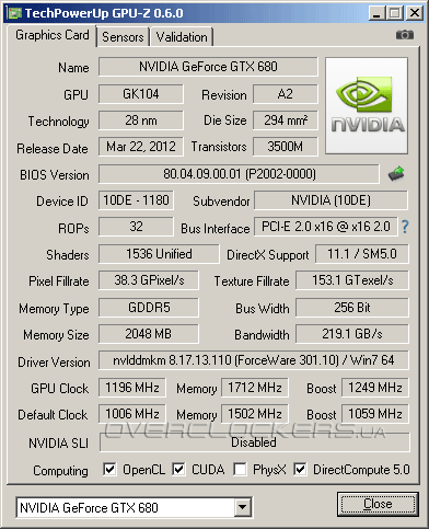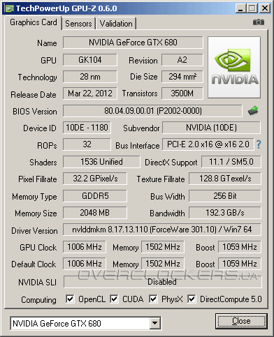 Вентилятор раскручивался до 2400 об/мин. Шум умеренный. Напрямую сравнить GeForce GTX 680 с референсным Radeon HD 7970 у нас не было возможности. Но то, что новинка тише и холоднее GeForce GTX 580, можем сказать уверенно.