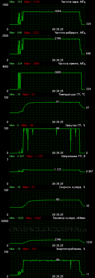Для мониторинга параметров и разгона видеокарты мы использовали MSI Afterburner 2.2.0 beta 15. Программа по старой памяти демонстрирует удвоенную частоту шейдернго домена, но в реальности все блоки у Kepler работают на одной частоте. Наш стандартный 12-минутный тест Crysis: Warhead на максимальных настройках качества со сглаживанием 8x прогрел карту лишь до 81 °C при 24 градусах внутри помещения. При этом энергопотребление почти все время было ниже 100%, что позволяло ядру большую часть времени работать на 1084 МГц, иногда поднимаясь и до 1110 МГц. Вместе с частотой динамически изменяется и рабочее напряжение.