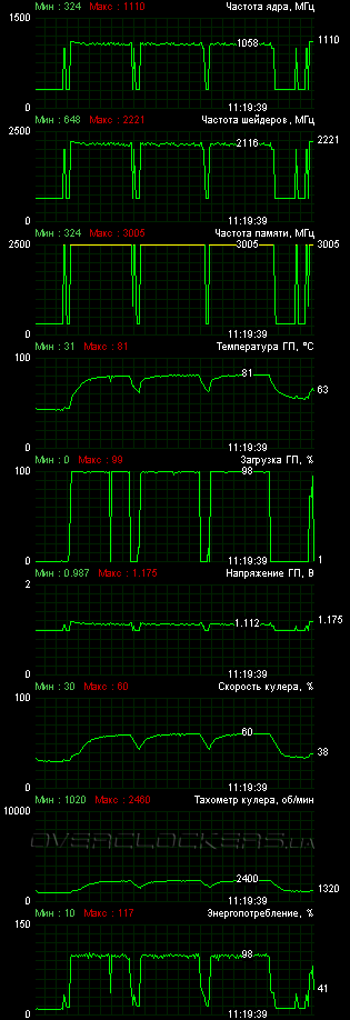 Самое интересное, что с максимальным порогом энергопотребления в большинстве приложений GPU почти всегда работал с максимально возможным ускорением на 104 МГц, т.е. при 1300 МГц. Это наглядно иллюстрирует скриншот загрузки в Crysis: Warhead. При этом энергопотребление не превышало 119%.