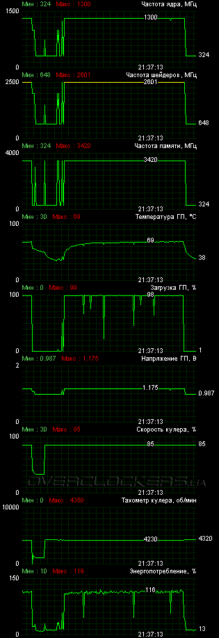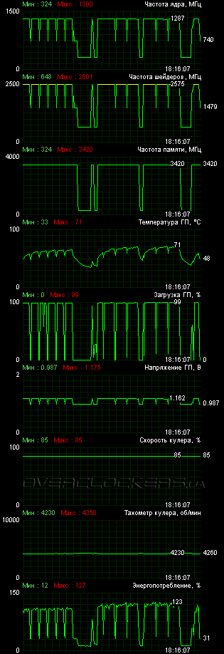 Самой большой «грелкой» для видеокарты оказался Witcher 2, прогревая ядро больше других игр. Но даже в этом приложении при разгоне видеокарта не превышала предел в 132% и работала на частотах близких к 1300 МГц.