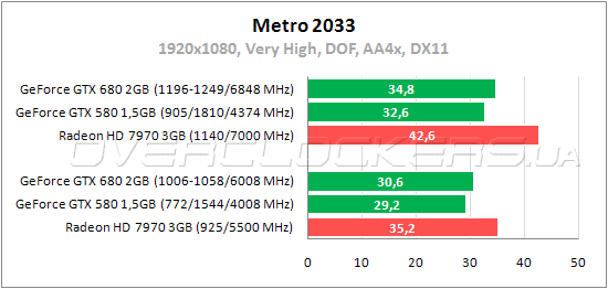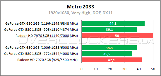 В Metro 2033 новичок NVIDIA выглядит не очень убедительно. В обоих тестовых режимах он незначительно обгоняет GeForce GTX 580 на 5—9% и уступает Radeon HD 7970 от 8,5% в более простом режиме до 15% при активации сглаживания. Разогнанный GeForce GTX 680 обгоняет работающий в номинале Radeon только в более простом режиме.