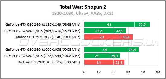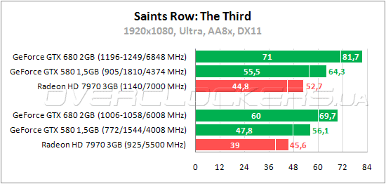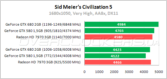 В этом тесте преимущество GeForce GTX 680 над GeForce GTX 580 достигает почти 56%, преимущество над Radeon HD 7970 равно 19%. Повышение частот помогает поднять результат почти на 18%. Разогнанный Radeon HD 7970 лишь на пару процентов обгоняет работающий в номинале GeForce GTX 680.