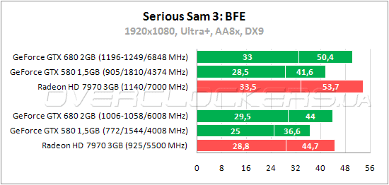 При максимальных настройках качества «Серьезный Сэм 3» создает весьма серьезную нагрузку на топовые видеокарты. GeForce GTX 680 чуть лучше Radeon HD 7970 по минимальному fps, но чуть слабее по среднему показателю. Так что можно констатировать примерное равенство соперников в номинальном режиме. При разгоне флагман AMD все же выходит вперед, но и разгон относительно начальных частот у него немного больше, чем у GeForce GTX 680.