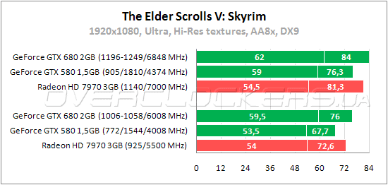 В Skyrim лидирует GeForce GTX 680. Небольшая разница в результатах (особенно по минимальному fps) снова говорит о недостаточной мощности CPU. Однако это не мешает GeForce GTX 680 немного улучшить минимальный fps при разгоне, в то время как у Radeon HD 7970 он остается прежним.