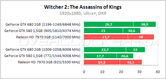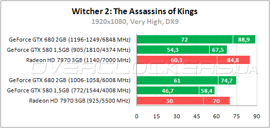 Во втором «Ведьмаке» новичок уверенно лидирует, демонстрируя максимальный отрыв от флагмана AMD по минимальному fps (20—22%). По среднеигровому показателю разница между ними 5—7%. Прирост от разгона достигает 18—19%, что как раз соответствует приросту по частоте GPU. В этой игре пропускная способность памяти не ограничивает потенциал GeForce GTX 680. Режим «запредельного качества» все еще остается очень тяжелым для рассматриваемых видеокарт, но с разгоном Kepler выдает вполне приемлемый fps.