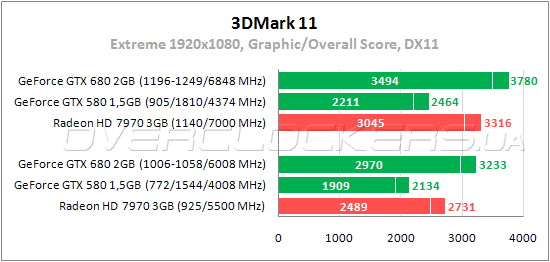В номинале у Radeon HD 7970 крошечное преимущество над GeForce GTX 680. В разгоне лидирует новичок NVIDIA. Прирост от разгона небольшой. Явно все упирается в мощность процессора, но почему-то прирост у карты AMD все равно меньше, чем у представителей NVIDIA. И крошечное увеличение результата абсолютно не соответствует разгону на 23% по частоте GPU и 27% по частоте памяти.