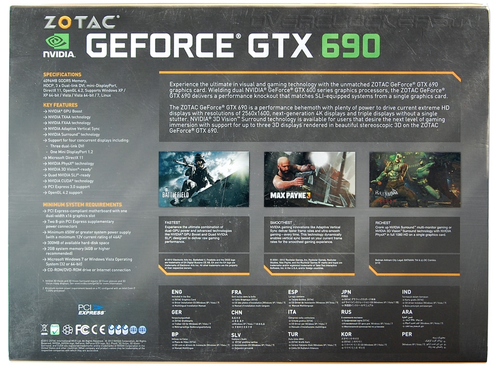 Если же говорить непосредственно о видеокарте Zotac, то все ее отличия от GeForce GTX 690 других компаний сводятся лишь к комплектации. Наличие сборника из трех игр серии Assassin’s Creed станет отличным бонусом для покупателя. Цена же не отличается от ценника прочих представителей серии.