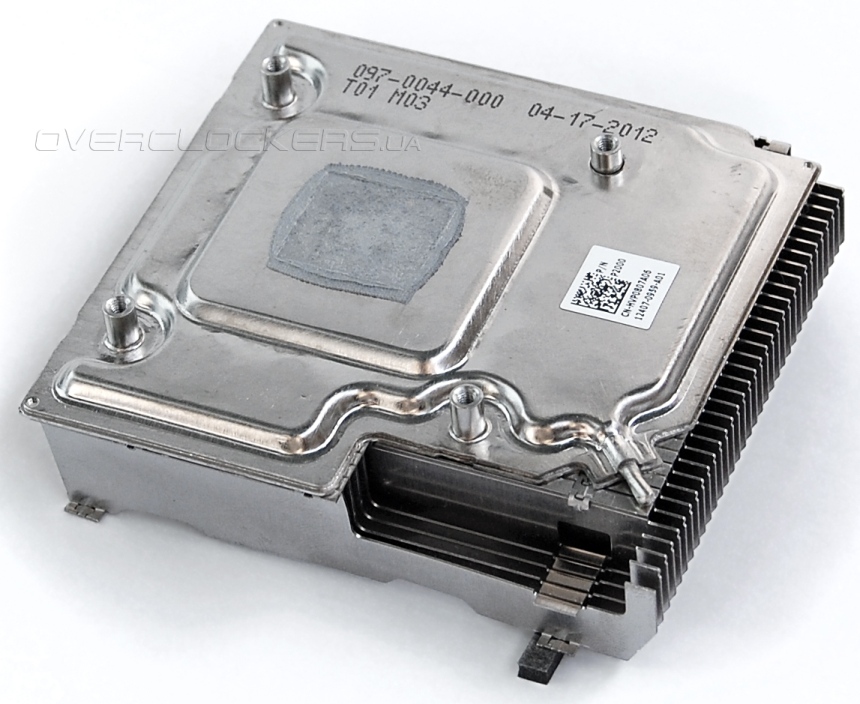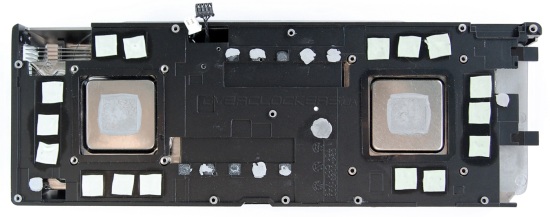Теперь давайте поближе взглянем на систему охлаждения. Всю поверхность платы накрывает массивная пластина, которая отводит тепло от силовых элементов системы питания и микросхем памяти.