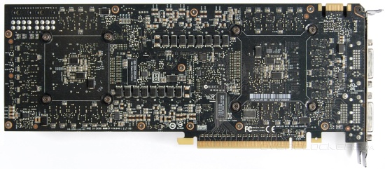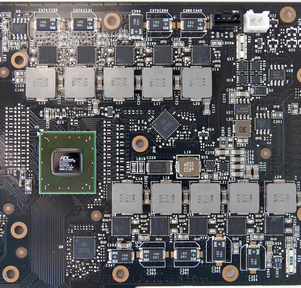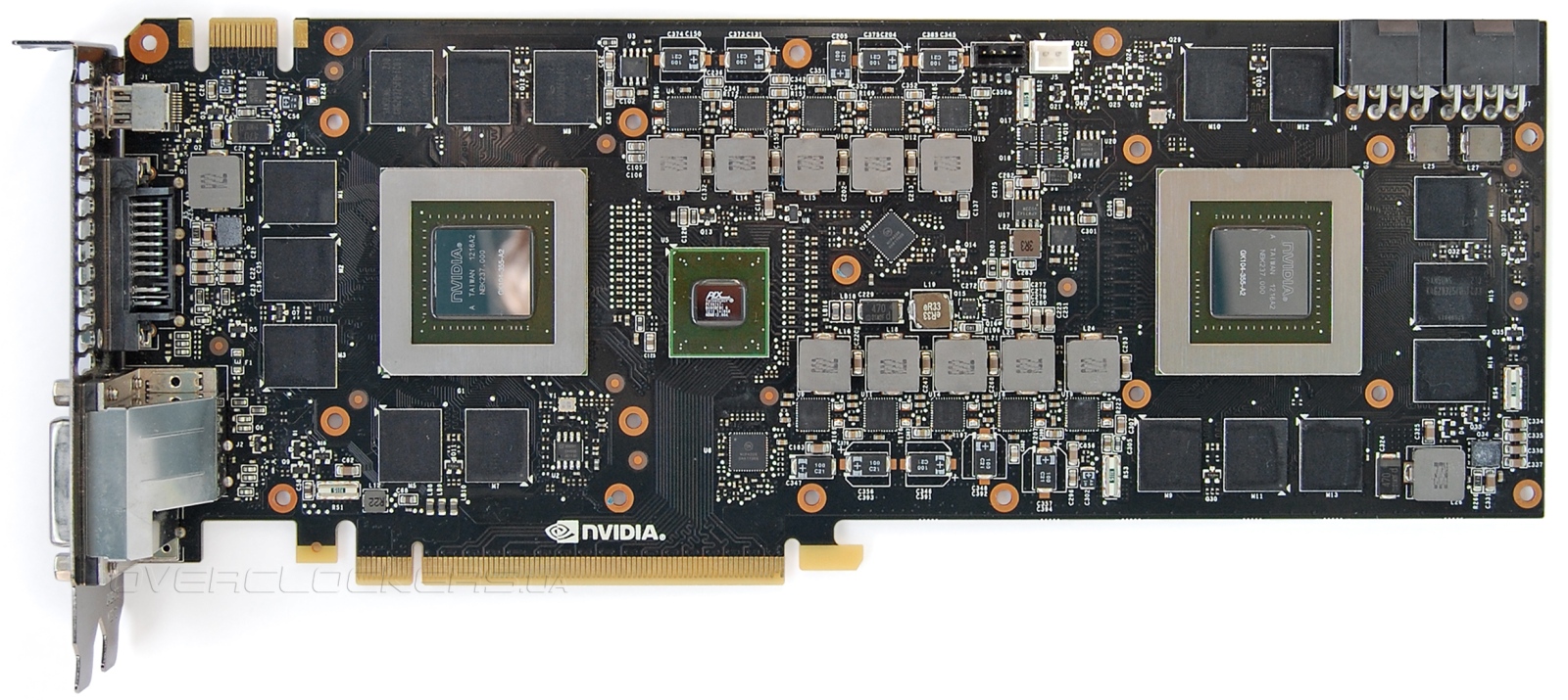 Маленький чип в центре — это коммутатор PEX 8747 от PLX Technology. Ранее на свои двухчиповые решения NVIDIA ставила коммутаторы собственной разработки и производства. А чипы PLX использовались AMD еще со времен Radeon HD 3870 X2.