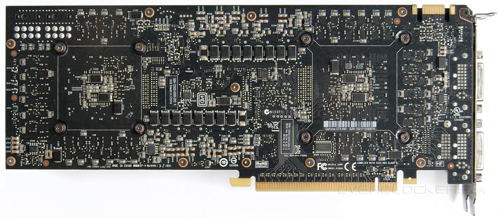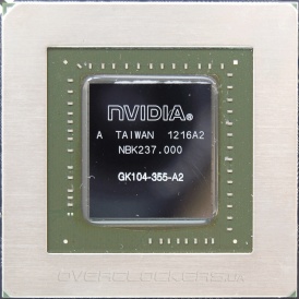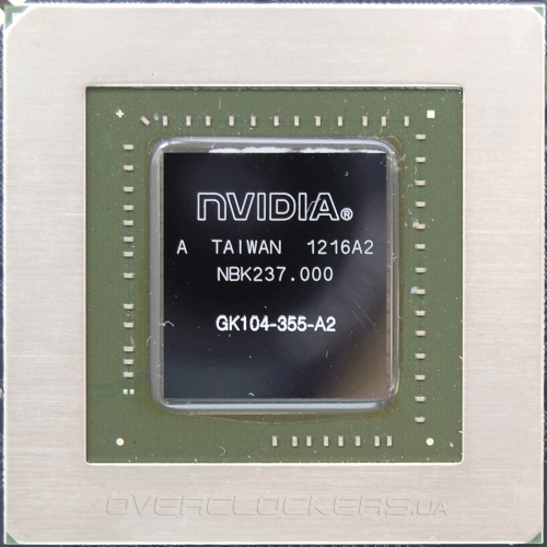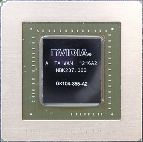 Память же функционирует на тех же 6008 МГц. Понижать ее частоту не стали, что вполне логично при 256-битной шине. Мы не раз отмечали, что в некоторых приложениях производительность GeForce GTX 680 явно упирается в пропускную способность памяти. Распаяны микросхемы Samsung K4G20325FD-FC03.